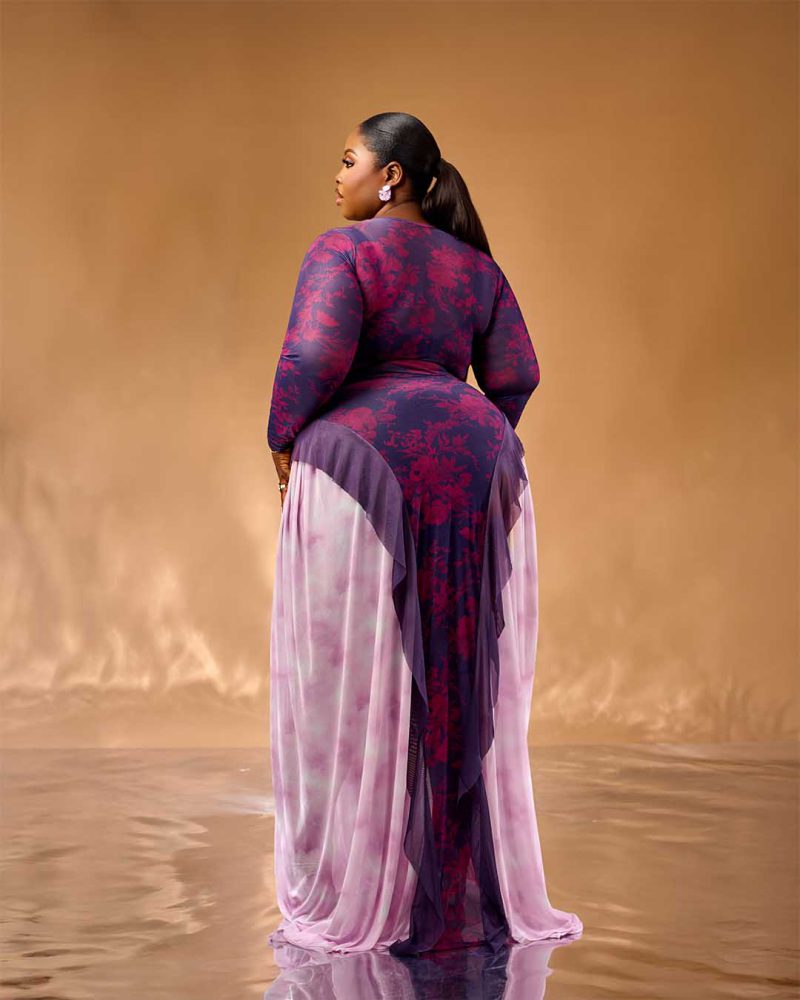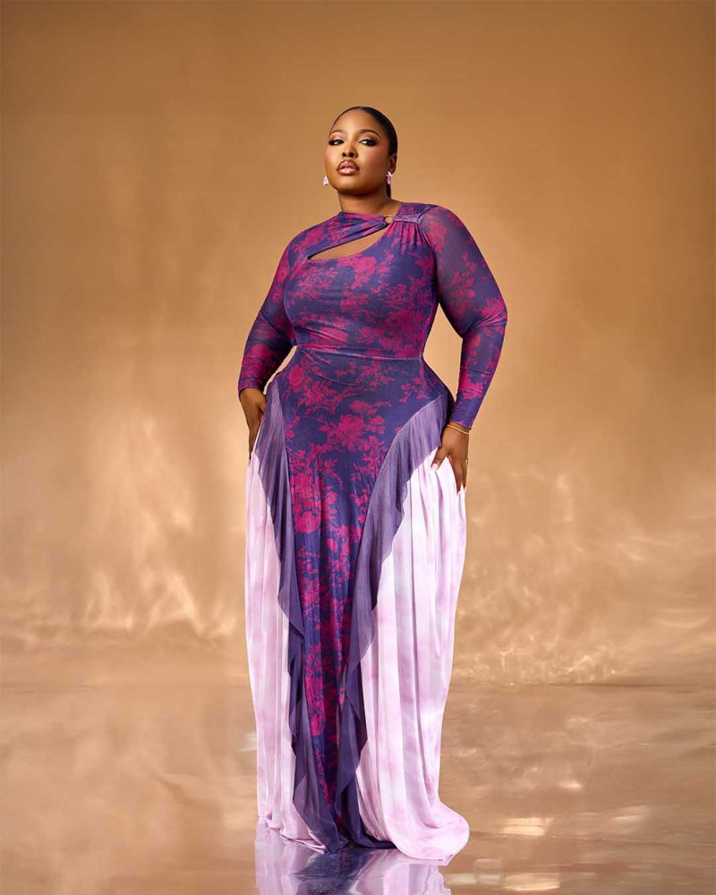 A long sleeve mesh dress with gather and flare design at the side. Adele is a fitted bodice with side flares, mix print and long sleeve with an asymmetric cut out neckline flowing into the floor.