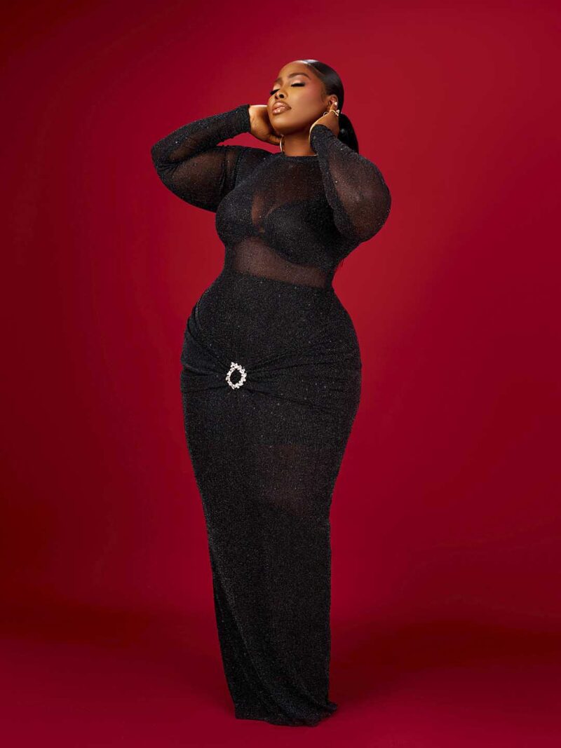 Make a bold statement with the April Elegance Gown — a masterpiece that celebrates sophistication and allure. Crafted with glimmering black fabric, this gown features a sheer illusion bodice that accentuates your curves with grace. The high-waisted silhouette flatters every figure, adorned with a sparkling crystal brooch detail for a touch of opulence.