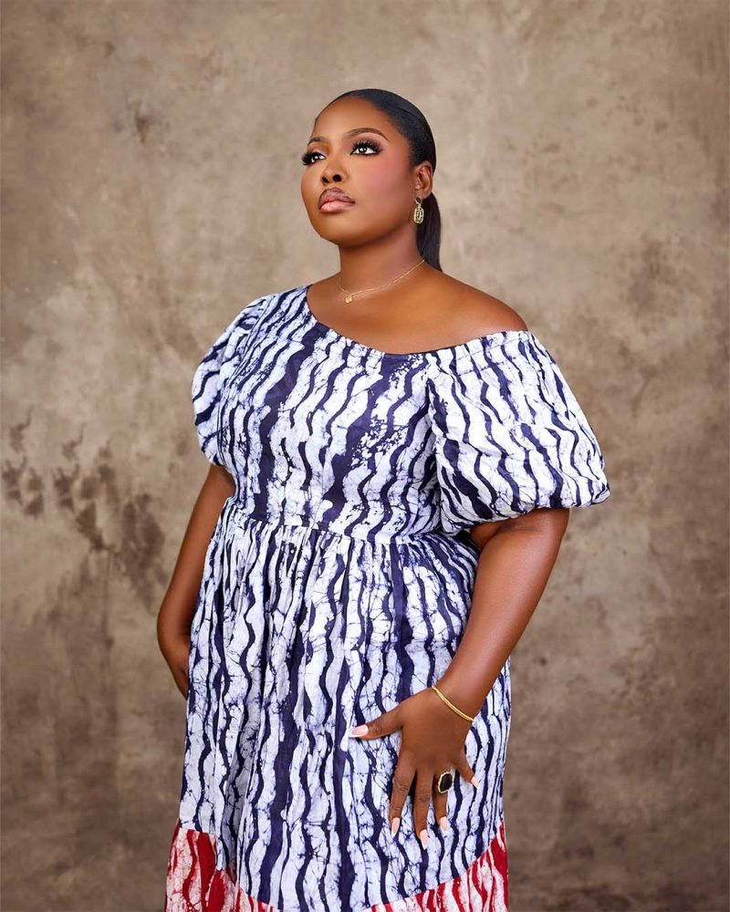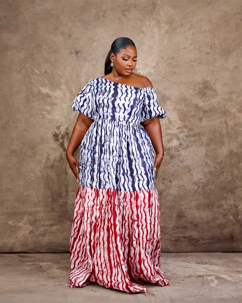 Adire pleated dress with Asymmetric neckline with a puff sleeve design made with two color mixed adire fabrics