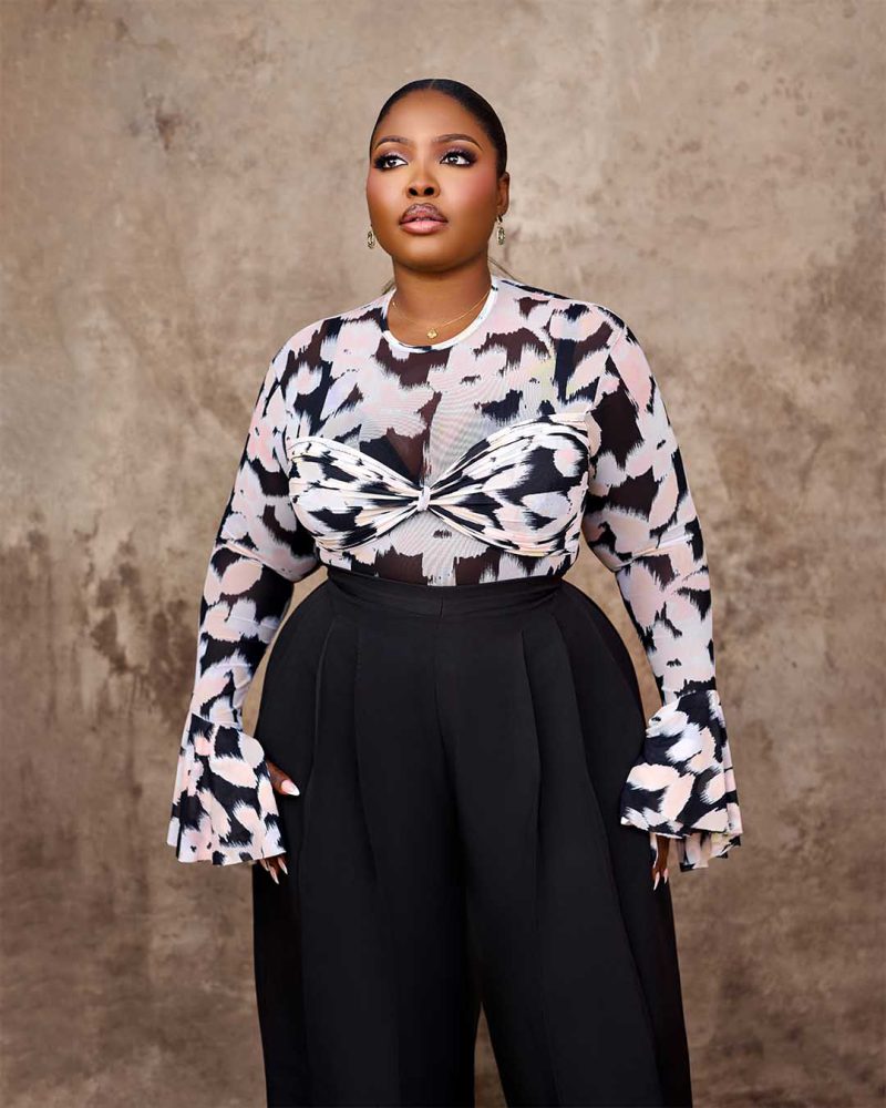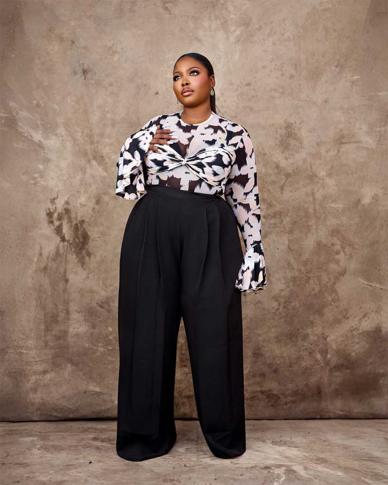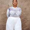 Long sleeve stretch mesh top with flare at the sleeve and a wide leg pleated pants/trousers.