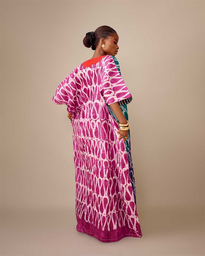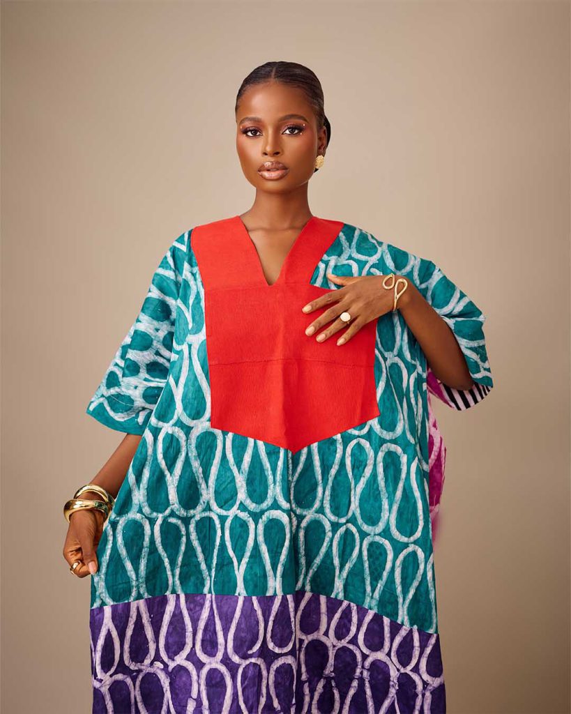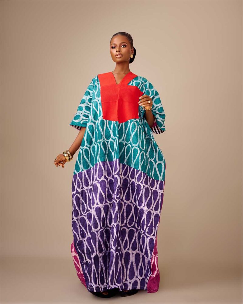 The Omone 3.0 dress is a vibrant and colorful Adire dress. It has a loose flow, with the top part in bold red, and the main body of the dress featuring an intricate, multi-colored pattern in shades of blue, purple, pink, and black.