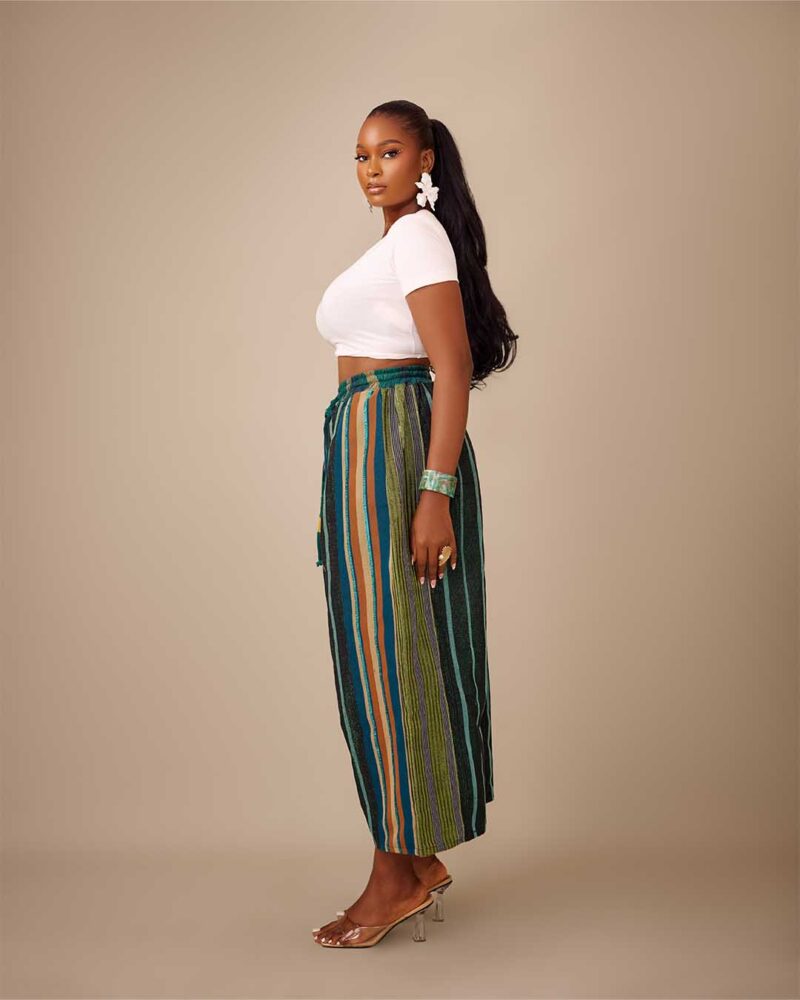 The Ore midi aso oke pants are a multifunctional wide-leg, high-waisted wardrobe stable. They are made from a vibrant, multicolored striped pattern with an elastic waistband, and pockets providing a comfortable fit.