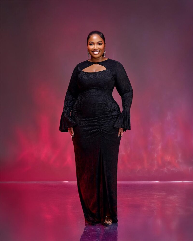 Elegant and timeless, this keyhole maxi features subtle waist ruching and flared sleeves for a refined yet striking look.