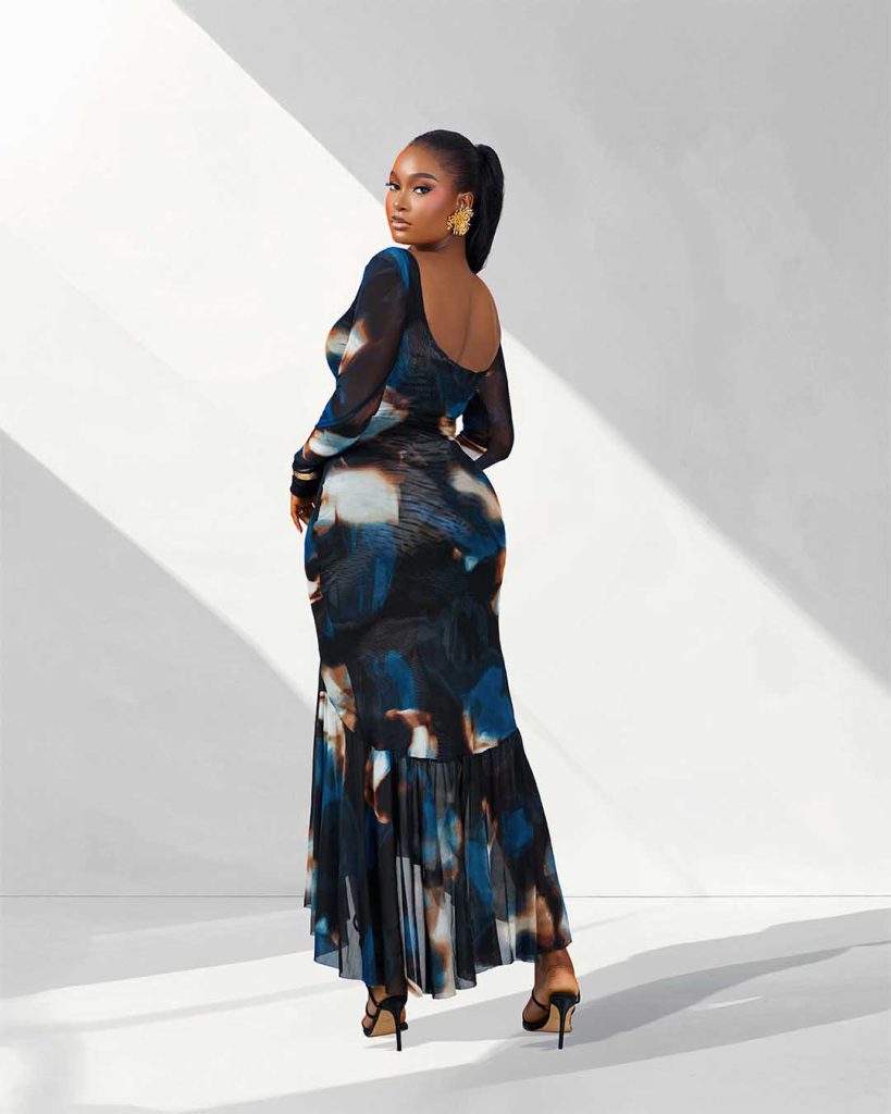 Long sleeve mesh dress, with abstract print and bottom pleats